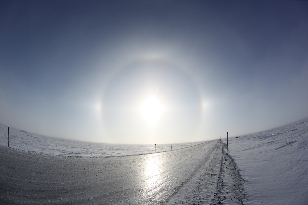 - Ánh sáng Mặt Trời chiếu vào những tinh thể băng này bị khúc xạ mạnh tạo thành một vòng tròn với nhiều màu sắc như cầu vồng bao quanh Mặt Trời.