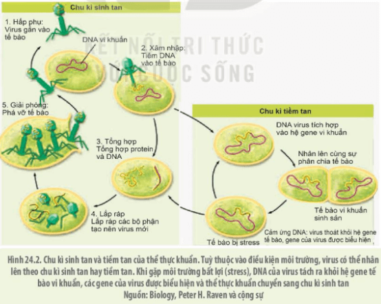 – Giai đoạn 5: Giai đoạn giải phóng: Virus ra khỏi tế bào chủ. Khi đã vào được bên trong tế bào, các virus nhân lên theo hai cách đó được gọi là chu kì sinh tan hoặc chu kì tiềm tan hay sử dụng cả hai cách trên.