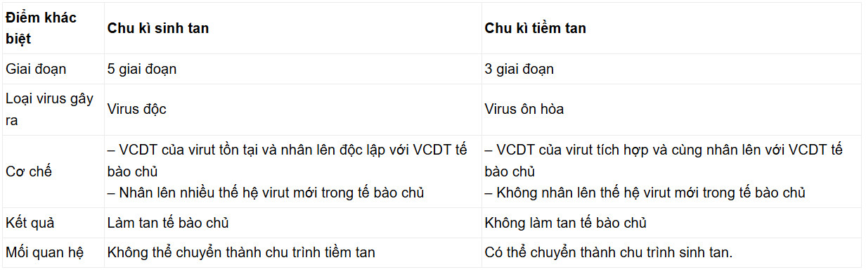 * Phân biệt chu kì sinh tan với chu kì tiềm tan của thực khuẩn thể