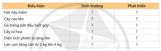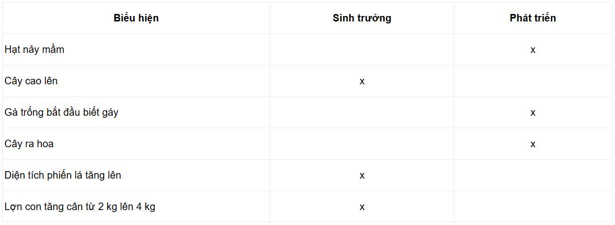 Câu hỏi SGK Sinh 11 Cánh Diều Bài 15 (trang 101): Những biểu hiện nào sau đây là biểu hiện của sinh trưởng, phát triển ở sinh vật: