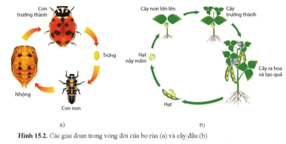 Câu hỏi 1 SGK Sinh 11 Cánh Diều Bài 15 (trang 103): Quan sát hình 15.2, mô tả những thay đổi trong vòng đời của bọ rùa (hình 15.2a) và cây đậu (hình 15.2b).