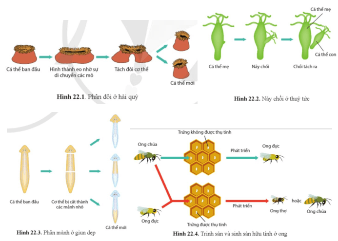 - Quá trình sinh sản của những loài động vật trong các hình trên đều có đặc điểm chung là: Các cá thể con đều được đều được tạo thành từ cá thể thế hệ trước, không có sự kết hợp của giao tử đực và giao tử cái.