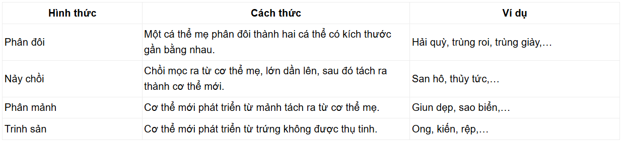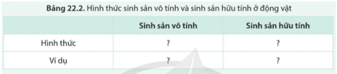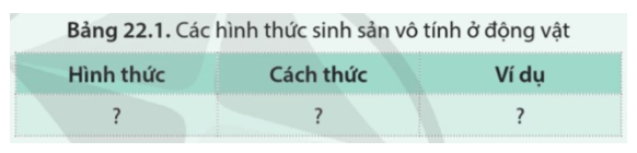 Luyện tập SGK Sinh 11 Cánh Diều Bài 22 (trang 144): Phân biệt các hình thức sinh sản vô tính ở động vật theo gợi ý ở bảng 22.1