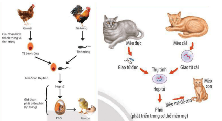 Luyện tập SGK Sinh 11 Cánh Diều Bài 22 (trang 146): Vẽ sơ đồ quá trình sinh sản hữu tính thể hiện được 4 giai đoạn ở một loài động vật mà em biết.