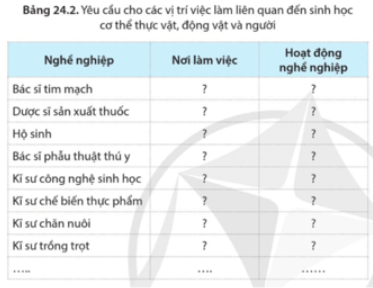 Luyện tập SGK Sinh 11 Cánh Diều Bài 24 (trang 157): Dựa vào hình 24.1 và bảng 24.1 hoàn thành bảng 24.2 về yêu cầu cho các vị trí việc làm liên quan đến Sinh học cơ thể thực vật, động vật và người.