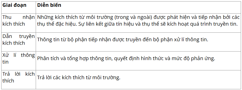 Câu hỏi 3 SGK Sinh 11 Chân trời sáng tạo Bài 14 (trang 92): Cơ chế cảm ứng ở sinh vật gồm những giai đoạn nào? Trình bày diễn biến ở mỗi giai đoạn đó bằng cách hoàn thành bảng sau:
