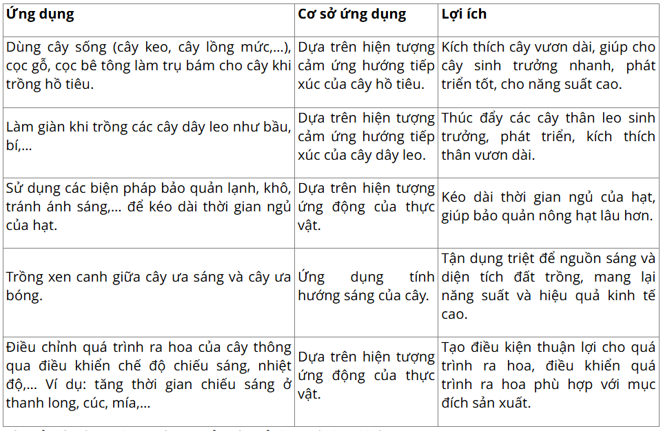 Câu hỏi 4 SGK Sinh 11 Chân trời sáng tạo Bài 15 (trang 96): Nêu một số ứng dụng hiện tượng cảm ứng ở thực vật trong thực tiễn. Cho biết mỗi ứng dụng đó dựa trên cơ sở loại cảm ứng nào và đã mang lại lợi ích gì cho con người bằng cách hoàn thành Bảng 15.1