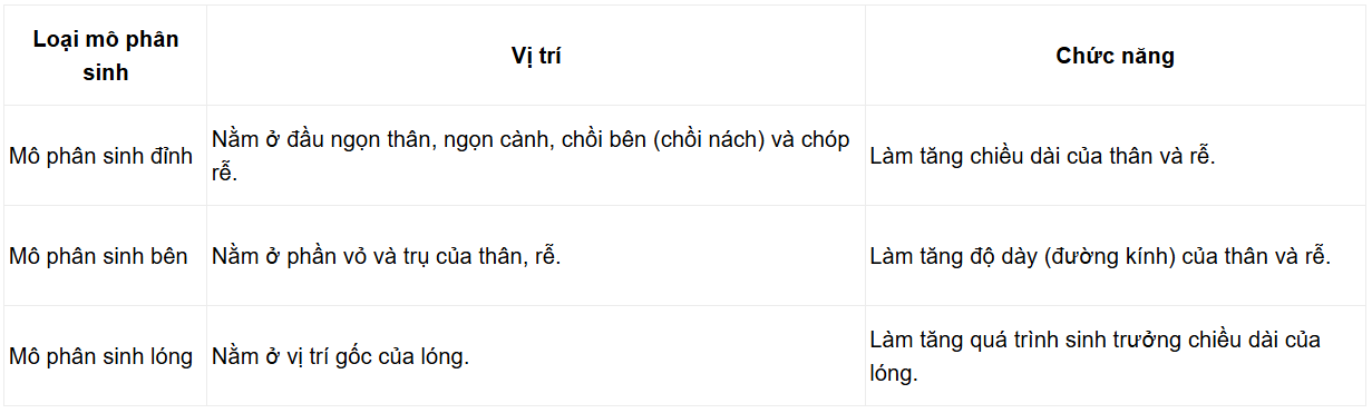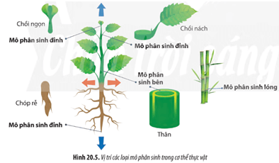Câu hỏi 3 SGK Sinh 11 Chân trời sáng tạo Bài 20 (trang 134): Quan sát các Hình 20.5, hãy cho biết vị trí và chức năng của các loại mô phân sinh trong cây.