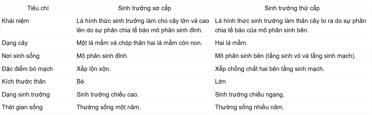 Luyện tập SGK Sinh 11 Chân trời sáng tạo Bài 20 (trang 135): Hãy phân biệt sinh trưởng sơ cấp và sinh trưởng thứ cấp ở thực vật.