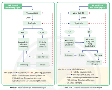 Câu hỏi 5 SGK Sinh 11 Chân trời sáng tạo Bài 26 (trang 173): Quan sát Hình 26.8 và 26.9, phân tích quá trình điều hòa sinh tinh và điều hòa sinh trứng ở người