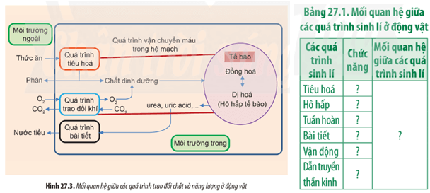 Câu hỏi 2 SGK Sinh 11 Chân trời sáng tạo Bài 27 (trang 182): Từ kiến thức đã học và dựa vào Hình 27.3, hãy nêu rõ chức năng và xác định mối quan hệ giữa các quá trình sinh lí trong cơ thể động vật (Bảng 27.1)