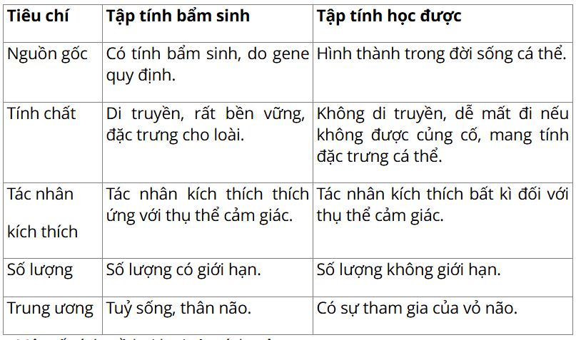 Câu hỏi 2 SGK Sinh 11 Kết nối tri thức Bài 18 (trang 117): Cho biết sự khác nhau giữa tập tính bẩm sinh và tập tính học được. Tìm thêm ví dụ về hai loại tập tính này.