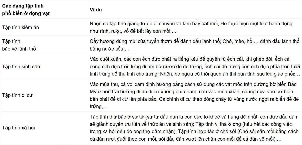 Câu hỏi 1 SGK Sinh 11 Kết nối tri thức Bài 18 (trang 119): Kể tên các dạng tập tính phổ biến ở động vật. Tìm thêm ví dụ cho mỗi dạng tập tính.