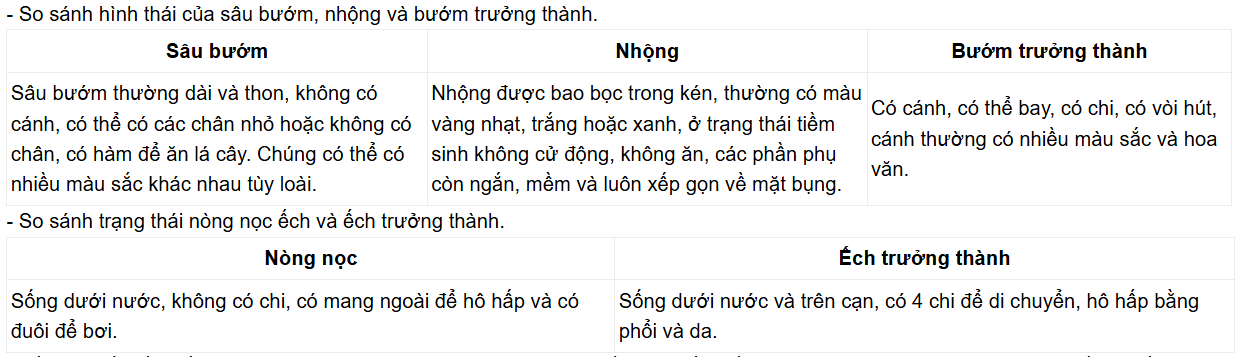 + Sâu bướm và nòng nọc có hình thái và cấu tạo rất khác so với bướm và ếch trưởng thành.