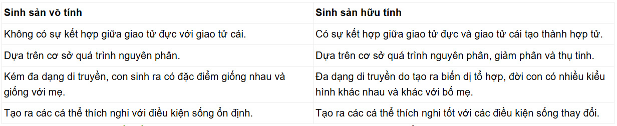 Câu hỏi 1 SGK Sinh 11 Kết nối tri thức Bài 27 (trang 181): Cho biết sự khác nhau giữa hai hình thức sinh sản vô tính và sinh sản hữu tính.