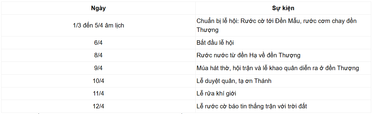 + Lễ rước nước từ đền hạ về đến đền Thượng, ngày mồng 8: tượng trưng cho việc tôi luyện vũ khí trước khi đánh giặc.