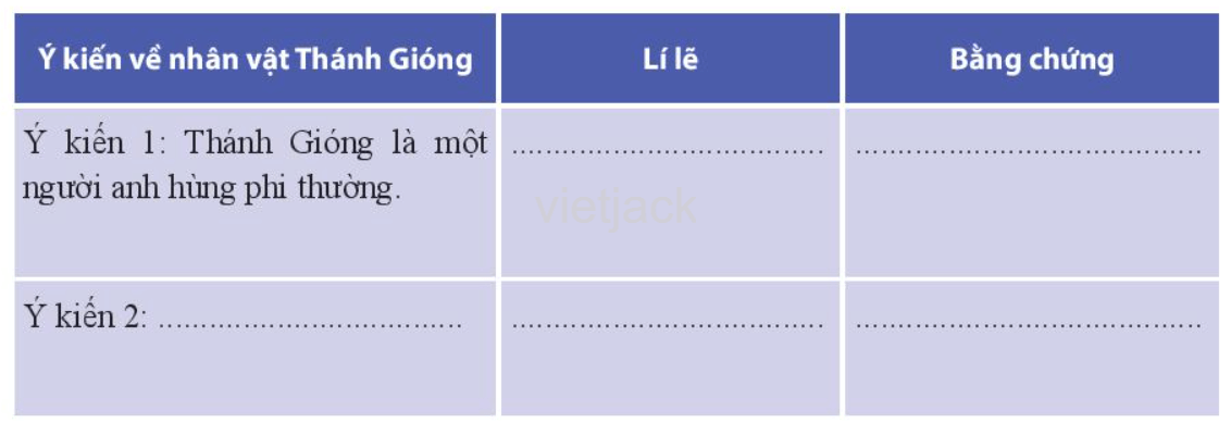 Câu hỏi 2 SGK Ngữ văn 6 CTST - Soạn bài Bàn luận về nhân vật Thánh Gióng (trang 45): Hãy xác định lí lẽ, bằng chứng mà tác giả đưa ra để củng cố ý kiến của mình và điền vào bảng sau: