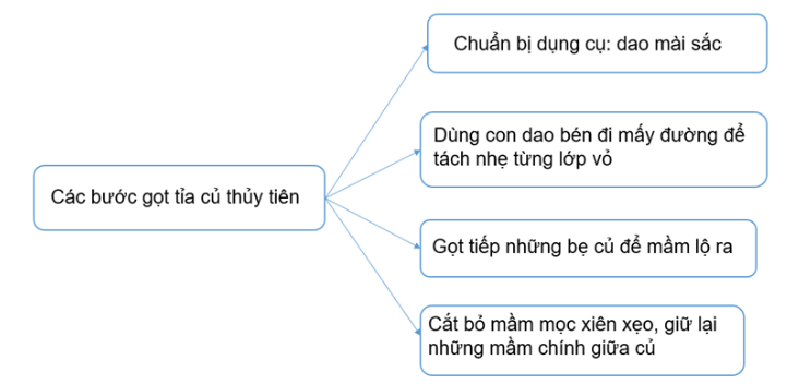 Câu hỏi 5 SGK Ngữ văn 7 CTST - Soạn bài Cách gọt củ hoa thủy tiên (trang 51): Vẽ sơ đồ tóm tắt các bước gọt tỉa củ hoa thủy tiên.