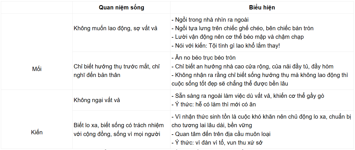 - Biểu hiện qua việc miêu tả mối như một kẻ vị kỉ, lười biếng, chỉ biết hưởng thụ cho “béo trục béo tròn”, còn kiến tuy gầy gò vất vả nhưng luôn chăm chỉ, cố gắng biết sống vì người người khác, biết lo cho cái chung, biết hướng tới tương lai vững bền, …