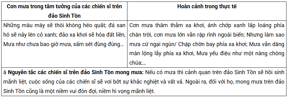 Câu 2 (trang 99 sgk Ngữ văn 12 Tập 2): Cơn mưa trong tâm tưởng của các chiến sĩ và trong thực tế có (những) điểm gì khác nhau? Theo bạn, vì sao các chiến sĩ trên đảo Sinh Tồn mong mưa như thế?