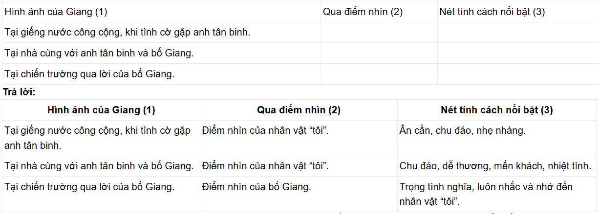 Câu hỏi 3 SGK Ngữ văn 10 CTST - Soạn bài Giang (trang 75): Đặc điểm, tính cách của một nhân vật trong truyện thường được thể hiện qua các hành vi, lời nói của nhân vật ấy trong hoàn cảnh giao tiếp cụ thể, gắn với một hay một số điểm nhìn nhất định (của người kể chuyện, của chính nhân vật hoặc của một nhân vật khác,...). Hãy phân tích tính cách của nhân vật Giang theo gợi ý trong bảng dưới đây (làm vào vở):