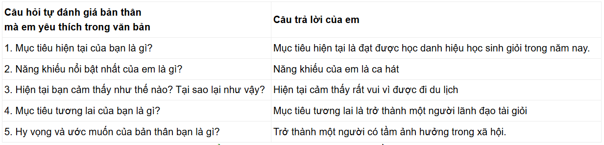 Câu hỏi 2 SGK Ngữ văn 8 CTST – Soạn bài Hiểu rõ bản thân (trang 104): Liệt kê một số câu hỏi dùng để tự đánh giá bản thân mà em yêu thích trong văn bản. Sau đó, trả lời những câu hỏi em đã chọn.