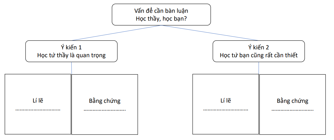 Câu hỏi 5 SGK Ngữ văn 6 CTST - Soạn bài Học thầy, học bạn (trang 43): Tóm tắt văn bản nghị luận là trình bày ngắn gọn nội dung của văn bản bằng ngôn ngữ của mình dựa trên việc nhận ra ý kiến của người viết, các lí lẽ, bằng chứng làm rõ cho ý kiến. Hãy hoàn thành sơ đồ sau và viết đọan văn tóm tắt văn bản Học thầy, học bạn.