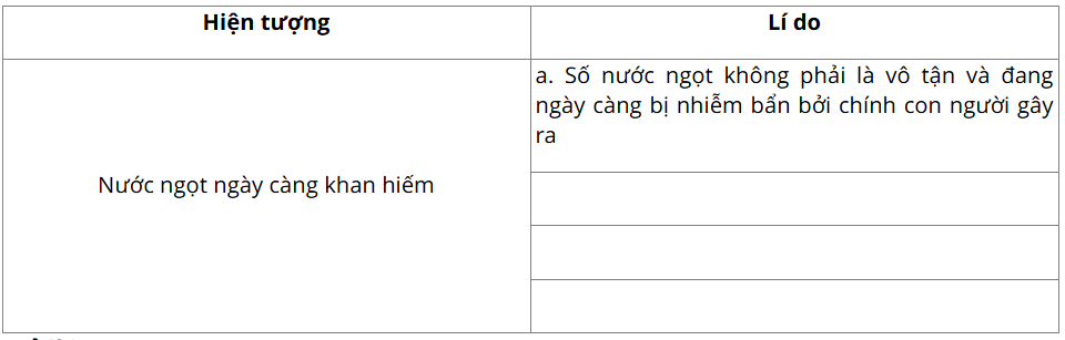 Câu hỏi 2 SGK Ngữ văn 6 CD - Soạn bài Khan hiếm nước ngọt (trang 53): Theo tác giả, có những lí do nào khiến nước ngọt ngày càng khan hiếm? Liệt kê ra vở các lí do theo bảng sau: