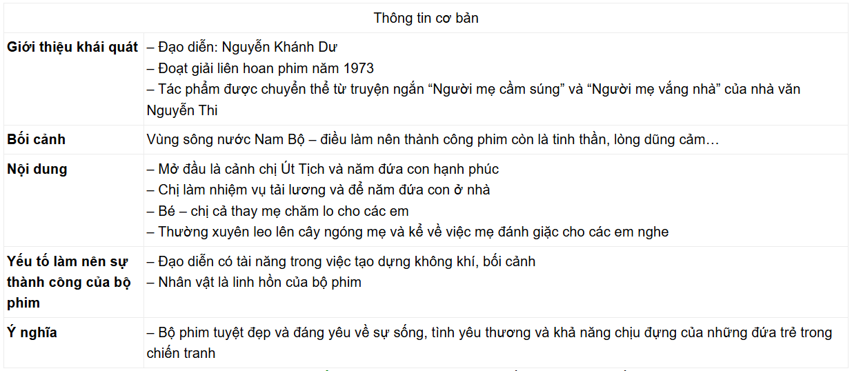 - Thông tin cơ bản: kể về cuộc sống của chị Út Tịch và năm đứa con trong chiến tranh Việt Nam giữa những ngày tháng khốc liệt nhất.