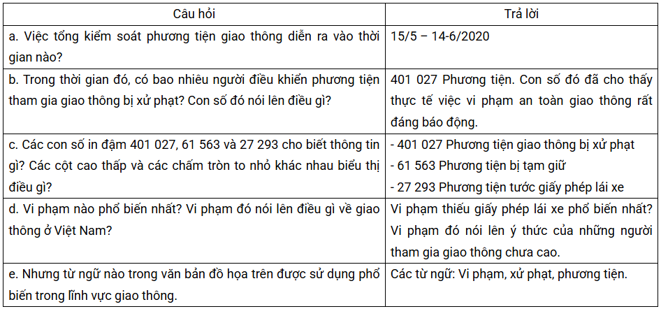 Câu hỏi 3 SGK Ngữ văn 7 CD - Soạn bài Tổng kiểm soát phương tiện giao thông (trang 81): Tìm thông tin thu được từ bản đồ hoạ và ghi vào vở nội dung trả lời các câu hỏi sau: