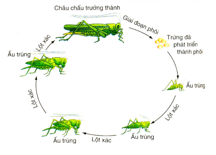 + Ví dụ: Ở châu chấu, con non có hình thái gần giống với con trưởng thành nhưng không có cánh, sau nhiều lần lột xác, chúng trở thành con trưởng thành.