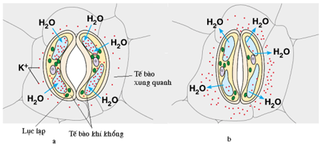 + Khi mất nước, thành mỏng hết căng và thành dày duỗi thẳng → khí khổng đóng lại. Khí khổng không bao giờ đóng hoàn toàn. (Hình b)