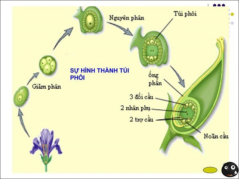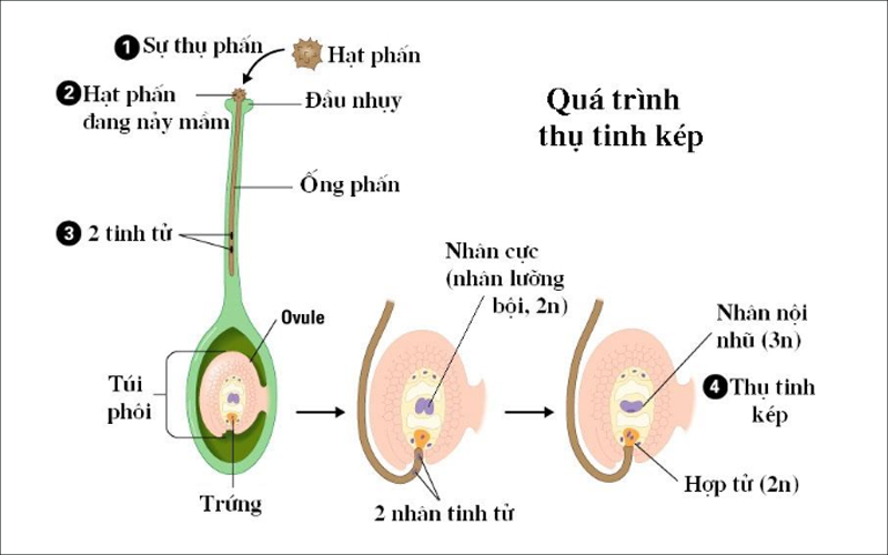 - Khi ống phấn sinh trưởng kéo dài theo vòi nhụy chạm tới túi phôi, xuyên qua lỗ noãn, sẽ giải phóng hai tinh tử (giao tử đực), một tinh tử kết hợp với trứng (giao tử cái) tạo nên hợp tử (2n), một tinh tử còn lại hợp nhất với tế bào lớn chứa hai nhân ở trung tâm túi phôi (nhân cực) hình thành nên nhân tam bội (3n).